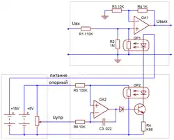 Контрольный фоторезистор включается в делитель стабилизированного напряжения или измерительный мост. Усилитель ошибки сравнивает напряжение на средней точке делителя с целевым значением и корректирует ток излучателя так, чтобы напряжение на средней точке равнялось целевому. Различные схемы цепи обратной связи позволяют реализовать пропорциональную, обратно-пропорциональную, кусочно-линейную, логарифмическую и т. д. передаточные характеристики схемы. При линейной характеристики управления оптопара превращается в аналоговый умножитель: ток через фоторезистор пропорционален произведению напряжения на фоторезисторе и управляющего напряжения[77][78].
