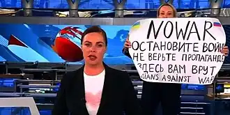 - ↑ Сотрудница Первого канала ворвалась в эфир программы «Время» с призывом остановить войну с Украиной. Её задержали. Meduza (14 марта 2022). Дата обращения: 16 августа 2022. Архивировано 14 марта 2022 года.