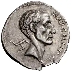 Аверс: Обнажённая голова консула Марка Клавдия Марцелла, смотрящая вправо; сзади — трискел, спереди — «MARCELLINVS» (имя консула или монетария).
