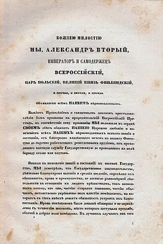 19 февраля (3 марта) 1861 года в Петербурге император Александр II подписал Манифест «О Всемилостивейшем даровании крепостным людям прав состояния свободных сельских обывателей» и Положение о крестьянах, выходящих из крепостной зависимости, состоявшие из 17 законодательных актов. Обнародован 21 февраля (5 марта) 1861 года.