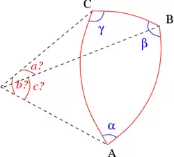Если даны (в угловых единицах) стороны , то углы треугольника определяются из теоремы косинусов[15]: