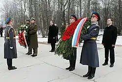 Возложение венков к мемориальному знаку на месте авиакатастрофы 10 апреля 2010 года. На заднем плане президент России Дмитрий Медведев и и.о. президента Польши Бронислав Коморовский