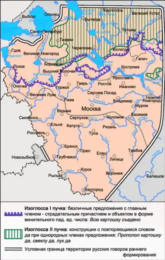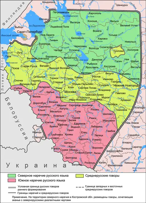 Несмотря на наличие общих языковых черт уже в раннем периоде формирования севернорусского наречия — звонкой взрывной /г/, оканья и других — его ареал в диалектном отношении был неоднороден, в северной и западной частях расселялись носители новгородского диалекта, в восточной — носители ростово-суздальского диалекта, кроме того ряд территорий был слабо освоен — устойчивое славянское население на них ещё было не вполне сформировано[44][45].