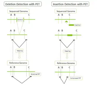 Метод секвенирования спаренных концов ДНК позволяет детектировать структурные вариации, произошедшие в геноме: вставки, делеции, инверсии и транспозиции. При создании библиотеки спаренных концевых фрагментов отбираются фрагменты ДНК равной длины, например 3 т.п.н.[6]. После выполнения оставшихся стандартных шагов (см. выше) получаем библиотеку. Секвенируем и картируем полученные риды. При картировании на референсный геном теги, полученные от одного фрагмента ДНК, должны накладываться на референсный геном на расстоянии около 3 т.п.н. (это расстояние задается при конструировании библиотеки) друг от друга и в определенной ориентации. Так, если расстояние между тегами меньше 3 т.п.н., это свидетельствует о наличие делеции в секвенируемом геноме, если больше — то о вставке. Более сложные примеры структурных вариаций генома могут быть получены при рассмотрении «противоречивых» мест картирования тегов (например, вставка последовательности из другого локуса)[2][6].