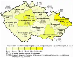 Кроме того, носители словацкого живут в ряде районов соседних со Словакией Австрии и Чехии, которые некогда объединяла в своём составе Австро-Венгерская империя (а вместе с Чехией Словакия была объединена позднее в едином Чехословацком государстве большую часть XX века). Так, в Чехии живут, по данным переписи 2011 года, 235 475 носителей словацкого как родного языка[26], представляя самую большую словакоговорящую диаспору в мире. Словаки расселены в Чешской Республике, как правило, дисперсно, исключение составляет область Моравская Словакия, жители которой имеют чешское самосознание, но их говоры ряд исследователей относит к словацкому языку[27]. В Австрии живут 10 234 говорящих на словацком, 2001[28].