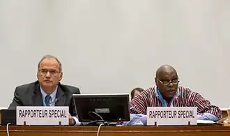 Кристоф Хейнс, бывший Специальный докладчик по вопросу о внесудебных казнях, казнях без надлежащего судебного разбирательства или произвольных казнях, и Майна Киаи, бывший Специальный докладчик по правам на свободу мирных собраний и ассоциации (2015).