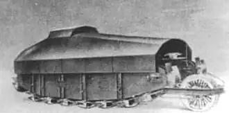 | Landkreuzer | Изображение отсутствует | 1915 — 1917 | 1917 | 1 прототип | В 1915 году, когда в Великобритании уже стартовала танковая программа, немецкий инженер предложил второй проект, на этот раз на гусеничном ходу. Представленная коммерческой комиссии модель танка Landpanzerkreuzer оказалась слишком маломощной, чтобы произвести положительное впечатление. От неё сразу же отказались, но Гобле вскоре построил третью демонстрационную модель. Очередной «сухопутный крейсер» обладал ходовой частью с одной гусеницей, как у танка конструкции Пороховщикова. Корпус собирался из стальных листов, по бортам соединявшихся под острым углом. Носовая и хвостовая часть была заострена наподобие тарана, чтобы танк мог легче преодолевать проволочные заграждения.