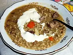 Анэли Кызлы Турция густой Булгур, мясные шарики и нут; часто подаётся с соусом из йогурта.