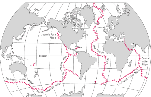 Лишь после Второй мировой войны, когда дно океана было исследовано более подробно, стала известна полная протяженность срединно-океанических хребтов. «Вема», корабль обсерватории Земли Ламонт-Доэрти Колумбийского университета, пересек Атлантический океан, записывая данные эхолота о глубине океанского дна. Команда под руководством Мари Тарп и Брюса Хизена пришла к выводу, что это огромная горная цепь с рифтовой долиной на ее гребне, проходящая через середину Атлантического океана. Ученые назвали его Срединно-Атлантическим хребтом. Другие исследования показали, что гребень хребта сейсмически активен[44], а в рифтовой долине были обнаружены свежие лавы[45]. Кроме того, тепловой поток земной коры здесь был выше, чем где-либо еще в бассейне Атлантического океана[46].