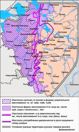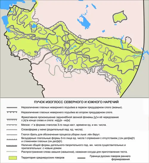 Пучок изоглосс северного и южного наречий на территории среднерусских говоров[15][16]