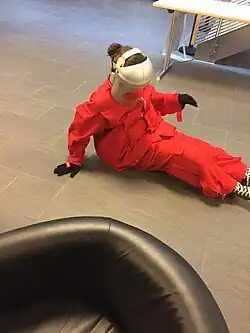 женщина в костюме для имитации пожилого возраста