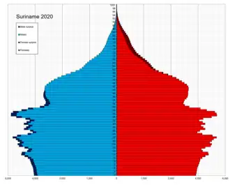 Возрастно-половая пирамида населения Суринама на 2020 год