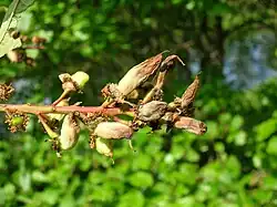 Поражения плодов слева: гипертрофированный плод ольхи, возбудитель — Taphrina alni справа: «кармашки» черёмухи, возбудитель — Taphrina padi | ||||||||||