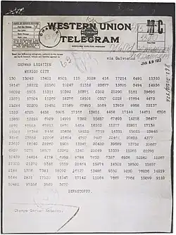 Телеграмма была перехвачена британской разведкой и расшифрована криптографической службой адмиралтейства («Комната 40»)[3]. После принятия определённых мер предосторожности дипломатического характера телеграмма была передана в США и 1 марта была опубликована в печати[2][прим. 1].