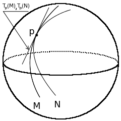 Два гладких подмногообразия и , вложенные в объемлющее пространство , пересекаются трансверсально в точке , если соответствующие касательные пространства и порождают всё касательное пространство объемлющего многообразия в точке , то есть .