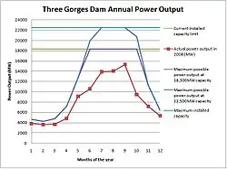 Во время сухого сезона с ноября по май мощность производства электроэнергии ГЭС ограничена объёмом потока реки, что видно на диаграммах справа. При наличии же достаточного потока, выходная мощность ограничена возможностями генераторов. Максимальные кривые мощности были рассчитаны на основе среднего расхода, при условии, что уровень воды составляет 175 м, а валовая эффективность энергоузла — 90,15 %. Фактическая мощность в 2008 году была получена на основе ежемесячной электроэнергии, отправленной в сеть[27][28].