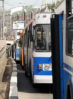 Тролле́йбус (троллей + бус) — безрельсовое механическое транспортное средство (преимущественно пассажирское, хотя встречаются троллейбусы грузовые и специального назначения[1]) контактного типа[1] с электрическим приводом, получающее электрический ток от внешнего источника питания (от центральных электрических станций)[1] через двухпроводную контактную сеть постоянного тока с помощью штангового токоприёмника[2] и сочетающее в себе как преимущества, так и недостатки трамвая и автобуса[3].