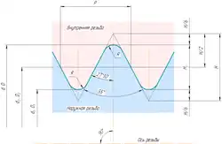 Дюймовая резьба с конусностью 1:16 (угол конуса φ = 3°34′48″). Угол профиля при вершине 55°. Связь между высотой исходного треугольника и шагом :