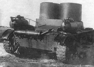Хотя из предложенных «Виккерс-Армстронг» вариантов Mk.E для серийного производства в СССР был отобран только двухбашенный пулемётный, ещё в 1931 году С. Гинзбург добился выделения финансирования на создание «танка-истребителя» с вооружением из 37-мм пушки «большой мощности»[сн 4] и 7,62-мм пулемёта в спаренной установке, размещавшихся в одиночной конической башне от танка «Т-19 улучшенный». Но реально работа над однобашенным Т-26 началась лишь в 1932 году. Освоение сборки конической башни из криволинейных бронелистов представляло сложности для советской промышленности, поэтому первая башня такого типа, созданная Ижорским заводом к весне 1932 года и предназначавшаяся для танка БТ-2, имела цилиндрическую форму. Аналогичную башню предполагалось устанавливать и на вариант «танка-истребителя» Т-26[43]. На испытаниях клёпаного и сварного вариантов башни предпочтение было отдано первому, который был рекомендован для принятия на вооружение после доработки выявленных недостатков и добавления в кормовой части ниши для установки радиостанции[44]. Для проведения войсковых испытаний Ижорский завод должен был изготовить партию из 10 башен с 21 января 1933 года[45].