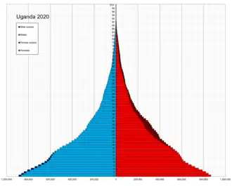 Численность населения 34 856 813[16][17][18] (перепись 2014 года). Население в 1931 году 3 557 534 жителя, в том числе европейцев 2 001 человек[19] Государственные языки: английский и суахили. Из африканских языков наиболее распространён луганда (племени ганда, используется как язык межнационального общения среди племён банту).