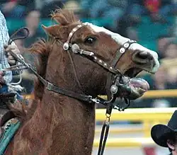 Мундштук (слово заимствовано в Петровскую эпоху из немецкого языка, где «mundstück» — «сложение», «mund» — «рот» и «stück» — «кусок»[4]) — железное сплошное удило, оказывающее по сравнению с трензелем усиленное воздействие на рот животного. Изобретён Пиньятелли в XVI веке, во времена расцвета высшей школы верховой езды. Может быть оснащён боковыми «щёчками» и/или может быть кольцевым.