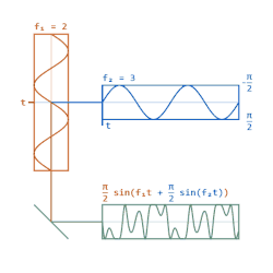 - где — максимальное изменение фазы модулированного сигнала относительно немодулированного, измеряется в угловых единицах, например, в радианах.