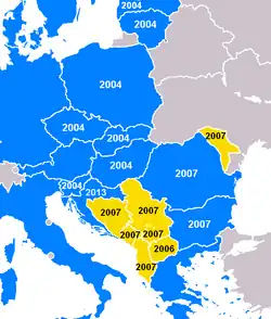 2013 год — Польша, Венгрия, Чехия, Словакия и Словения вступили в ЕС (2004), затем — Болгария и Румыния (2007), после — Хорватия (2013); присоединились Македония (2006), затем — Албания, Босния и Герцеговина, Косово, Молдавия, Черногория и Сербия (2007).