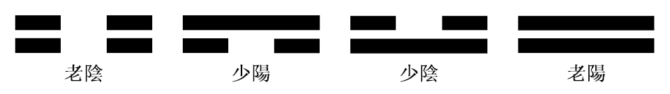 Каждая из комбинаций имеет собственное наименование (слева направо): Старая Инь 老陰, Молодой Ян 少陽, Молодая Инь 少陰, Старый Ян 老陽.