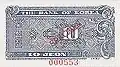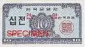 10 чонов | 90×50 | синий | Надпись «Банк Кореи» и номинал (по-корейски) |