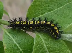 Самка откладывает яйца по 30—40 штук на обратную сторону листьев кормовых растений. Всего самка может отложить до 200 яиц. В молодом возрасте гусеницы держатся группой, скелетируя верхушечные листья. Зимуют вместе в сплетении листьев кормовых растений. После зимовки ведут одиночный образ жизни. Интересная особенность в питании гусениц: до зимовки они питаются на кустарниках и подросте ясеня, тополей, осин и ив, а после зимовки переходят на различные виды травянистых растений (чаще из семейства губоцветных). Стадия куколки длится 12 дней.
