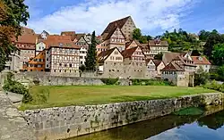 - К югу от старого города над долиной Кохера возвышается монастырь Комбург, окружённый средневековыми стенами с семью башнями. До секуляризации в 1803 году имел статус имперского аббатства. Сейчас монастырь занимает институт повышения квалификации.