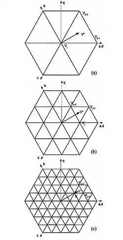 Техника МОВ может быть легко применима для всех многоуровневых инверторов. Рисунок справа показывает векторы пространства для традиционных двух-, трёх- и пятиуровневых инверторов. Эти векторные диаграммы универсальны независимо от типа многоуровневого инвертора. Другими словами, рисунок справа действителен для пятиуровневого зафиксированного на диод, зафиксированного на конденсатор, или расположенного каскадом инвертора. Смежные три вектора могут синтезировать желаемый вектор напряжения путем вычисления рабочего цикла (Tj, Tj+1, и Tj+2) для каждого вектора.