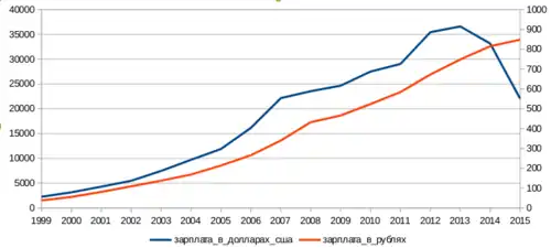Средний оклад после удержания налогов 63 975 руб.[17][18] / 787,48 $ в месяц (2023-Q2)
