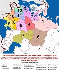 В 1871 году П. П. Семёнов-Тян-Шанский разделил европейскую Россию (вместе с Финляндией, Царством Польским и Кавказом) на 14 «естественных» областей, уточнив их границы уже не по губерниям, а по уездам. Для нужд государственной статистики России учёный предложил 12-частную классификацию, привязанную к губерниям[2].