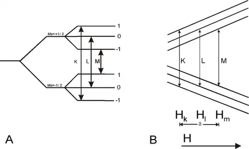 Если поместить свободный радикал с результирующим моментом количества движения J в магнитном поле с напряжённостью B0, то для J, отличного от нуля, в магнитном поле снимается вырождение, и в результате взаимодействия с магнитным полем возникает 2J+1 уровней, положение которых описывается выражением: W = gβB0M, (где М = +J, +J-1, …-J) и определяется Зеемановским взаимодействием магнитного поля с магнитным моментом J. Расщепление энергетических уровней электрона показано на рисунке.