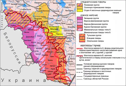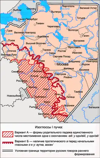 Изоглоссы варианта Б в сравнении с изоглоссами варианта А продвигаются севернее и охватывают территорию западных среднерусских акающих говоров (главным образом Псковской группы), а изоглоссы варианта А остаются в пределах южного наречия[18].