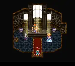 Геймплей Chrono Trigger. В локации находятся три NPC, с которыми можно заговорить; два сундука с предметами; выходы из локации обозначены углублениями в стене.