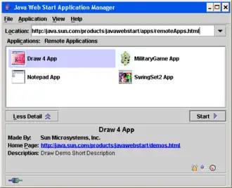 - Приложения, созданные с помощью технологии Java Web Start, можно запустить с помощью браузера, однако механизм, лежащий в основе этого процесса, совершенно отличен от запуска аплетов. Браузеры тесно связаны с системой поддержки выполнения программ, написанных на языке Java, которая запускает аплеты. Технология Java Web Start гораздо самостоятельнее. Браузер просто запустит внешнюю программу, как только загрузит дескриптор приложения, созданного с помощью технологии Java Web Start. Для этого используется тот же механизм, что и в приложениях Adobe Acrobat или RealAudio. Даже конкурирующие поставщики браузеров не могут вмешаться в работу этого механизма.