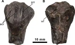 Голотип CMP-MS-03 обнаружен в 2013 году в слоях формации Арсильяс-де-Морелья, датированных ранним аптом (хотя новые палинологические данные указывают на баррем), провинция Кастельон, Испания. Он представляет собой частичный скелет, включающий: целый правый дентарный зуб (имеется ещё 13 зубов, но они фрагментарны и плохо сохранились), 6 почти полных спинных позвонков, тело спинного позвонка, несколько фрагментов остистых отростков спинных позвонков, фрагменты двух спинных рёбер, почти полный крестец, 2 гемальные дуги хвостовых позвонков, левую и правую подвздошные кости, неполные левые и правые лобковые и седалищные кости и правую большеберцовую кость[1].