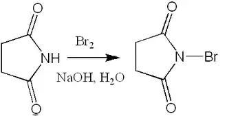 N-Бромсукцинимид синтезируют бромированием сукцинимида, при этом бромирование может производиться как действием брома на сукцинимид в присутствии щелочи (лабораторный метод)[12]:
