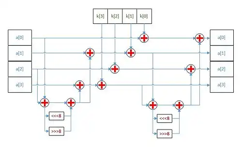 Алгоритм NOEKEON[4] выполняет 16 раундов преобразований с последующим применением функции Theta. Блок входных данных State представляет собой четыре 32-битных слов от a[0] до a[3].