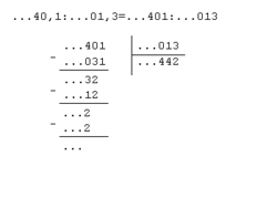 Нетрудно доказать, что любое целое p-адическое число, не кратное p, обратимо в кольце , а кратное p однозначно записывается в виде , где x не кратно p и поэтому обратимо, а . Поэтому любой ненулевой элемент поля может быть записан в виде , где x не кратно p, а n любое; если n отрицательно, то, исходя из представления целых p-адических чисел в виде последовательности цифр в p-ичной системе счисления, мы можем записать такое p-адическое число в виде последовательности , то есть, формально представить в виде p-ичной дроби с конечным числом цифр после запятой и, возможно, бесконечным числом ненулевых цифр до запятой. Деление таких чисел можно также производить аналогично «школьному» правилу, но начиная с младших, а не старших разрядов числа.