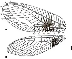 Крылья относительно закруглённые, костальное поле передних крыльев широкое, закругленное в основании, затем прямое к вершине крыла. Переднее крыло с сигмовидным Rs, близко сближающимся с псевдомедиальной (Psm) в основании: первые пять r-rs поперечных жилок конвергентны, остальные поперечные жилки субпараллельны; семь внутренних градиентных поперечных жилок, сливающихся с Psm; девять внешних градиентных поперечных жилок; три поперечные жилки между Cu1 и Cu2, 1-я задняя краевая поперечная жилка раздвоена задним ответвлением, присоединяющимся к Cu2. Заднее крыло с пятью внутренними градиентными поперечными жилками, семью наружными градиентными поперечными жилками; жилки крыла с щетинками относительно удлинённые и расположенные на ножке, ножки длиннее в базальной части крыла, цвет щетинок соответствует рисунку крыла и цвету жилкования крыла; крыло прозрачное с отметинами, в основном жилкование бледно-зелёное, костальные поперечные жилки переднего крыла тёмные спереди на 1-3 поперечных жилках и сзади на 8-10 поперечных жилках; базальная субкостальная поперечная жилка темная; мембрана затемнённая, жилкование тёмное в медиальной части обоих крыльев от жилки R до заднего края, отметины темнее сзади с ячейками (например, dcc, c2 и cu2) с белыми фенестрациями; базальная часть ячейки m2 затемнена; пятно у основания крыла на кубитальной жилке; четвёртая задняя краевая поперечная жилка дистально тёмная[1].