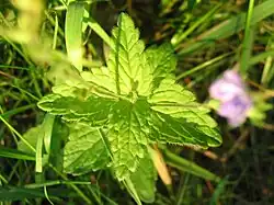Листья округло-яйцевидные до продолговато-яйцевидных, длиной 1,5—3 см, шириной 1—2 см, туповатые, надрезанно-тупозубчатые или городчатые, редко почти перисторассечённые на тупые доли, опушённые, морщинистые, у основания округлые или почти сердцевидные. Нижние листья коротко черешчатые, остальные сидячие.
