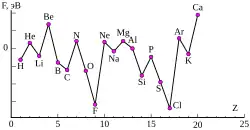 На рисунке представлена зависимость энергии сродства к электрону атомов от порядкового номера элемента. Наибольшим сродством к электрону обладают атомы галогенов (3—4 эВ).
