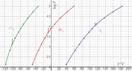 | lg(P[Па]) | атм | Cl2 | Br2 | I2 |