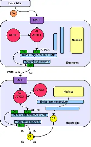 Медь является необходимым элементом для всех высших растений и животных. В токе крови медь переносится главным образом белком церулоплазмином. После усваивания меди кишечником она транспортируется к печени с помощью альбумина.