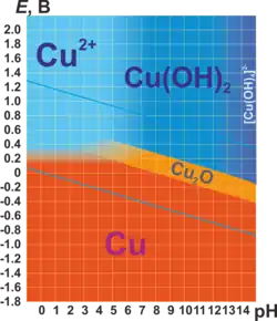 В соединениях медь проявляет две степени окисления: +1 и +2. Первая из них склонна к диспропорционированию и устойчива только в нерастворимых соединениях (Cu2O, CuCl, CuI и т. п.) или комплексах (например, [Cu(NH3)2]+). Её соединения бесцветны. Более устойчива степень окисления +2, которая даёт соли синего и сине-зелёного цвета. В необычных условиях и комплексах можно получить соединения со степенью окисления +3, +4 и даже +5. Последняя встречается в солях купраборанового аниона Cu(B11H11)23−, полученных в 1994 году.