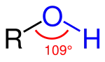 Молекулы спиртов, подобно молекуле воды, имеют угловое строение. Угол R−O−H в молекуле метанола равен 108,5°[56]. Атом кислорода гидроксильной группы находится в состоянии sp³-гибридизации. Спирты имеют существенно более высокие температуры плавления и кипения, чем можно было бы предполагать на основании физических свойств родственных соединений. Так, из ряда монозамещённых производных метана, метанол имеет необычно высокую температуру кипения, несмотря на относительно небольшую молекулярную массу[57]: