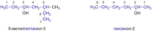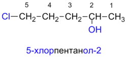 - Если при различных вариантах нумерации цепи гидроксильная группа получает один и тот же локант, то цепь нумеруют в том направлении, при котором другой заместитель получает наименьший локант.